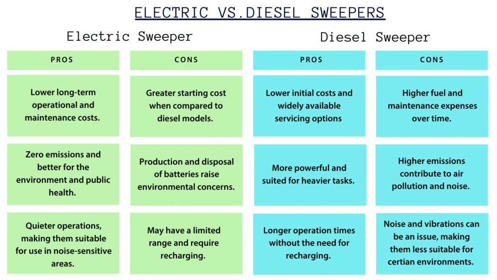 - Environmental Impact: Electric street sweepers reduce emissions and lower air pollution for a healthier environment. This aligns with Canada’s commitment to reducing greenhouse gas emissions and combating climate change.