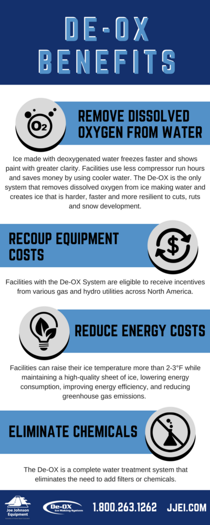 Reduce your energy costs and save by using cooler water to reduce compressor run hours. The De-OX Ice Making System works by removing dissolved oxygen from water before being applied to the ice surface, producing quality ice without the cost of heated water.