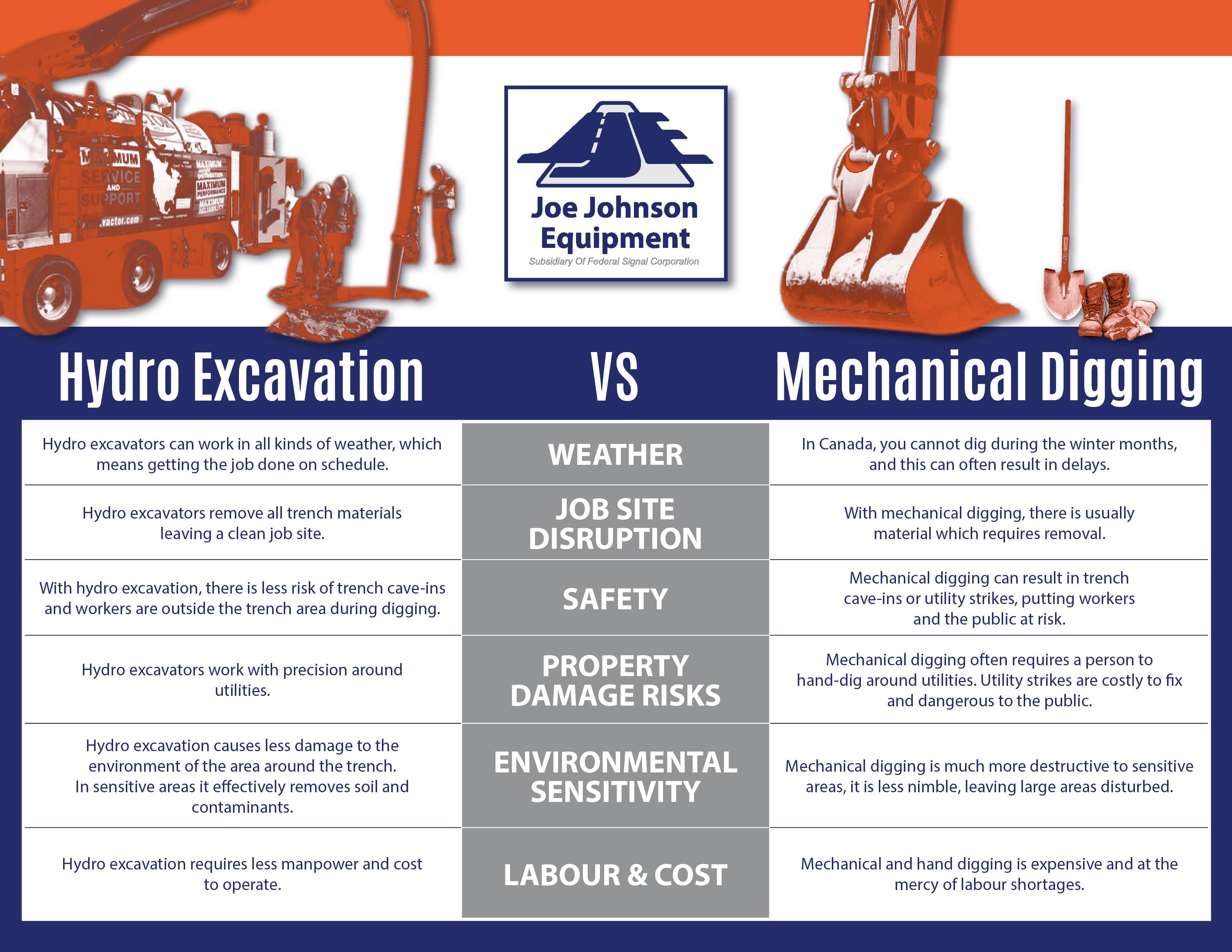 This infographic provides a side by side comparison of Hydro Excavation Vs. Mechanical Digging to show how hydrovacs are the clear winner when it comes to safety, cost and the environment.
